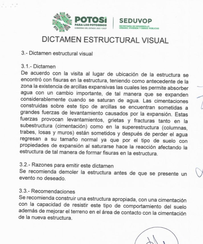 Dicho dictamen fue realizado por el Ingeniero Pedro Ramos Álvarez, quien es el titular de la Unidad de Proyectos y Costos, quien determinó que la estructura se encontró con fisuras en diversas partes de la misma, siendo estos daños que se han ido generando debido a la naturaleza del suelo en la que fue construida, puesto que ha sufrido de levantamientos causados por la expansión, lo que le ha generado levantamientos, grietas y fracturas, tanto en la cimentación como en la subestructura que abarca las columnas, trabes, losas y muros.