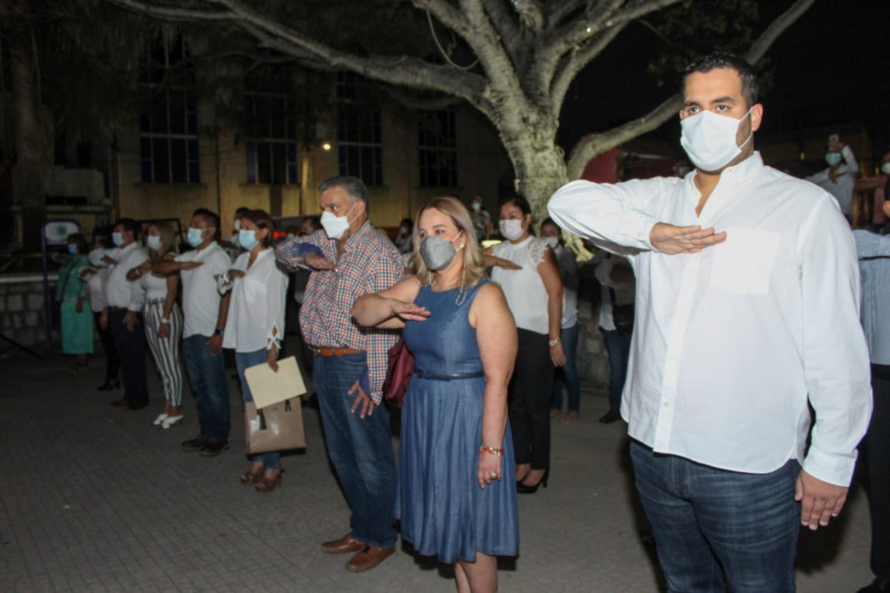 El presidente municipal de Ciudad Valles David Armando Medina Salazar, durante los honores a la bandera que se realizó en la explanada de la plaza principal, acompañado de su esposa la Presidenta del Sistema Municipal para el Desarrollo Integral de la Familia Ena Avendaño Uscanga, David Medina su hijo, de regidores, funcionarios y población que asistió a la ceremonia.