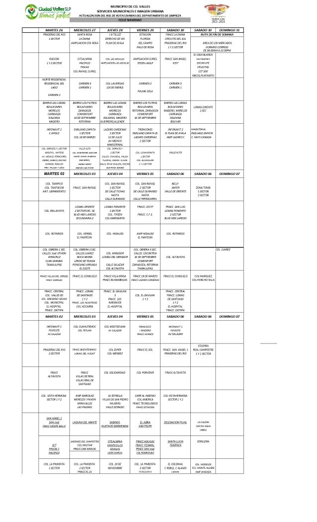 Ciudad Valles, S.L.P.- El Ayuntamiento de Ciudad Valles informó que el servicio de limpieza no estará disponible el lunes 25 de diciembre y el lunes 01 de enero del 2024, medida que tiene como objetivo permitir que los trabajadores municipales disfruten de estos días festivos en compañía de sus seres queridos.