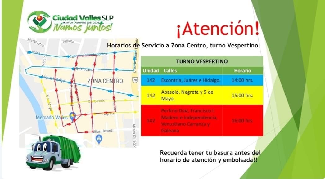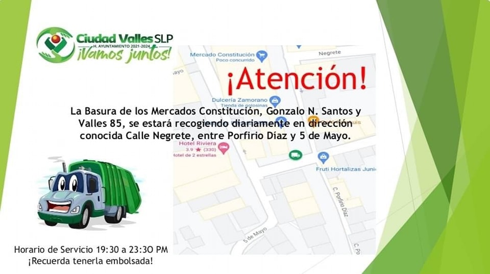 Estas serán las ubicaciónes que por esta semana tendrá el camión recolector para la zona de los mercados.Recomendamos sacar la basura 10 minutos antes del horario fijado y una atenta invitación a no tirar basura fuera de los horarios establecidos para así tener una ciudad más limpia.