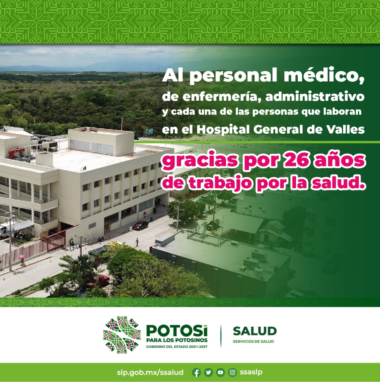 Al conmemorar el 26 aniversario de este edificio, el Hospital General de Ciudad Valles brinda la atención a los habitantes de los 20 municipios que conforman la huasteca, asà como de estados vecinos como Tamaulipas, Veracruz e Hidalgo, a cuyos habitantes se les brinda atención hospitalaria, medicina externa, atención oncológica y de enfermedades renales crónicas.