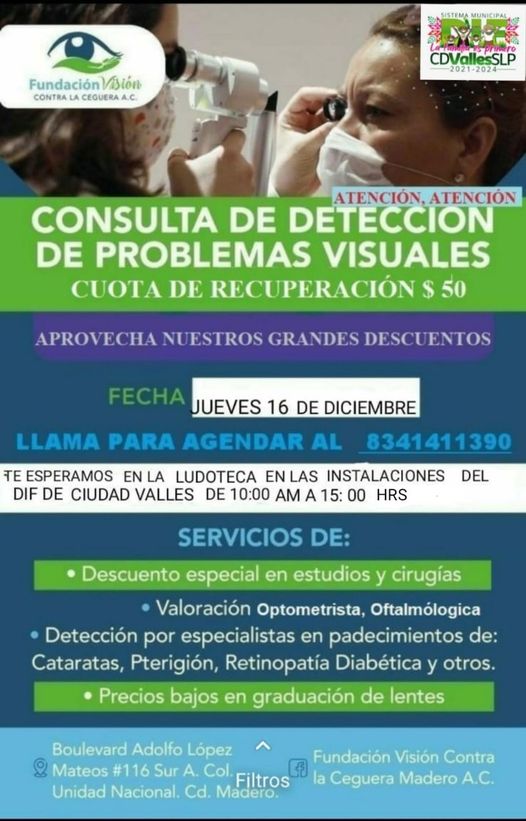 Ciudad Valles, S.L.P.- El Sistema Municipal DIF y la Dirección de Servicios Municipales de Salud del Ayuntamiento de Ciudad Valles invitan a la población en general a las Consultas de Detección de Problemas Visuales, el próximo jueves 16 de diciembre a una brigada que tendrá lugar en las instalaciones del SMDIF.
