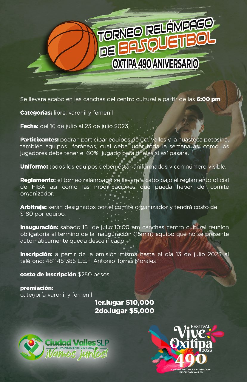 La coordinaciĂłn general del festejo del 490 aniversario de la fundaciĂłn del municipio de Ciudad Valles, invita a la poblaciĂłn a participar en el Torneo RelĂĄmpago de Basquetbol, que se llevarĂĄ a cabo del domingo 16 al domingo 23 de julio, a partir de las 6 de la tarde en las canchas del Centro Cultural, donde se podrĂĄ participar en la categorĂa libre, varonil y femenil.