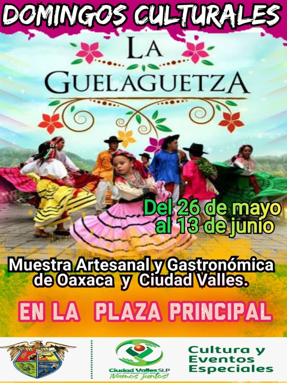 Ciudad Valles, S.L.P.- El Ayuntamiento de Ciudad Valles, a través de la Dirección de Cultura y Eventos Especiales invitan a toda la población a asistir a la exposición gastronómica y artesanal de La Guelaguetza, que se encontrará instalada en la plaza principal del 26 de mayo al 13 de junio.