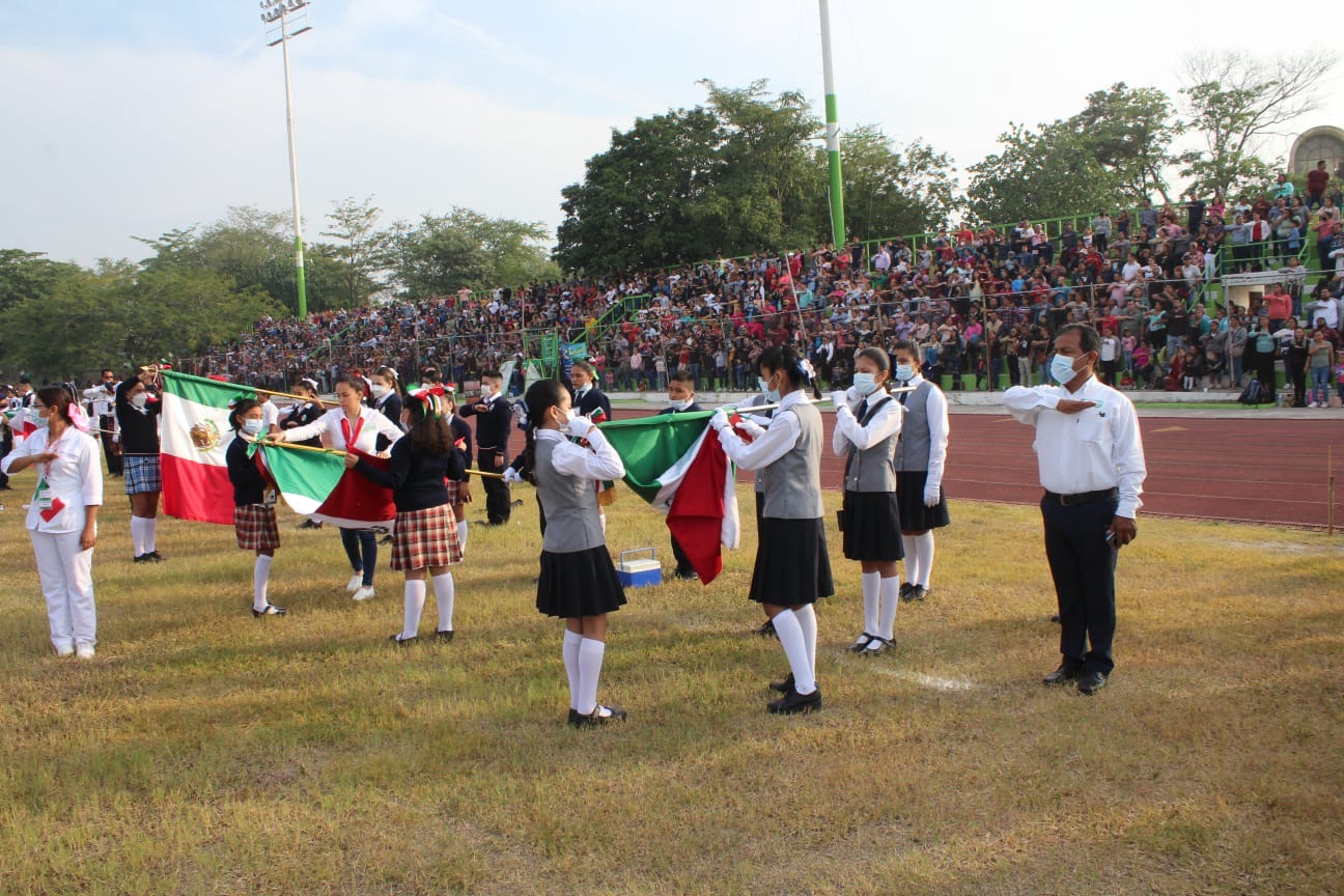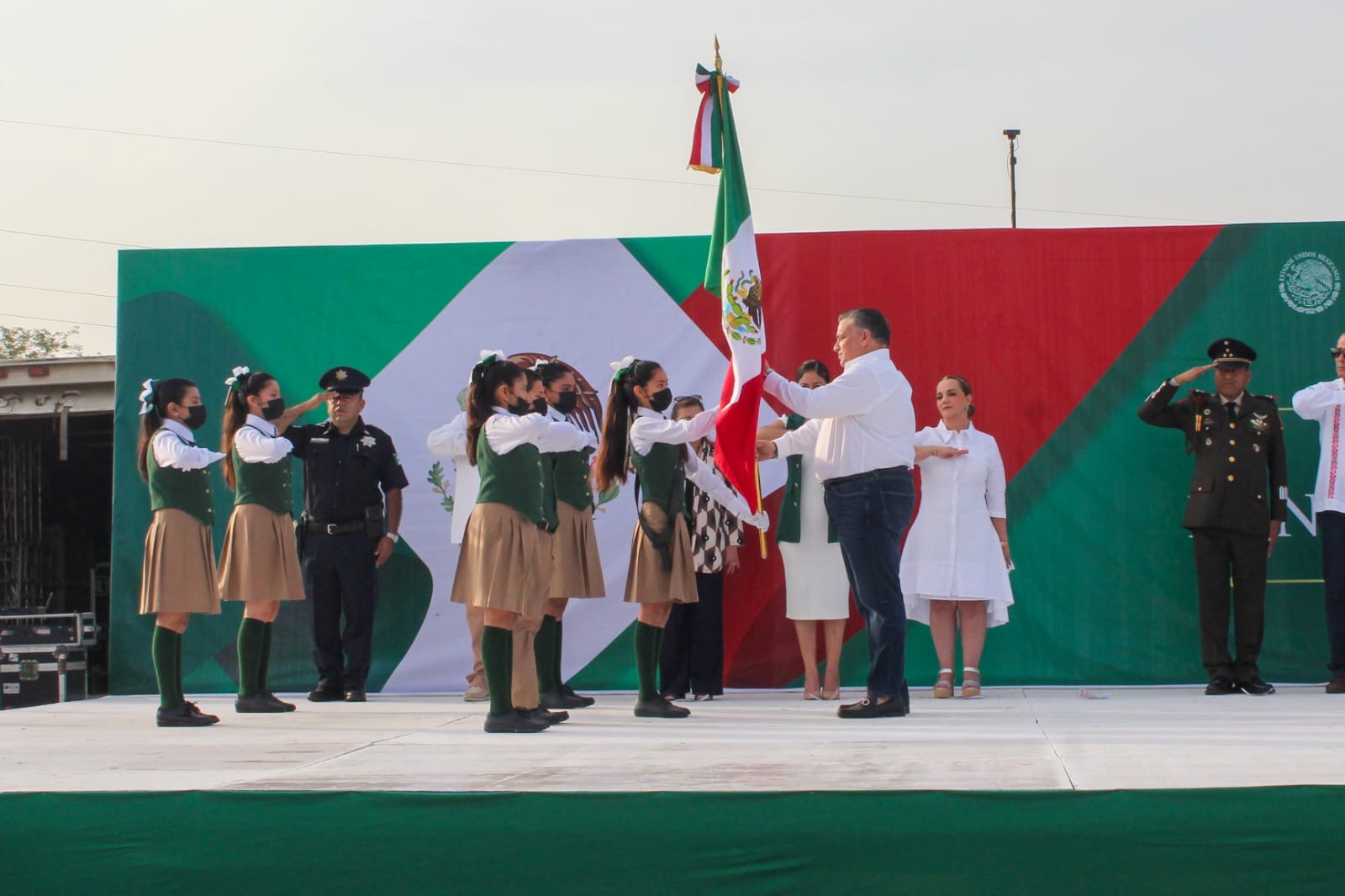 La imponente presencia de la banda de guerra monumental marcó el inicio de la ceremonia, entonando con gallardía la marcha militar «Águilas» y otros himnos patrióticos que llenaron de fervor el recinto. Los honores a la bandera estuvieron a cargo de la primaria Graciano Sánchez, mientras que el discurso oficial fue pronunciado por la destacada alumna Kayla del Carmen Fajardo Pérez, del 3″A» de la primaria Benito Juárez, quien inspiró a los presentes con sus palabras de compromiso y amor a la patria.