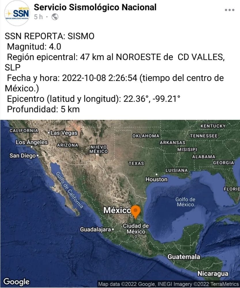 Lino Alberto Gutierrez, titular de PCM, señaló que de acuerdo al registro del Servicio Sismológico Nacional, el temblor de 4.0 grados en la escala de Richter, ocurrió a las 2:26 horas a 47 kilómetros al noroeste de Ciudad Valles a una profundidad de 5 kilómetros, prácticamente en el mismo epicentro que el registrado el pasado martes 4 de octubre.