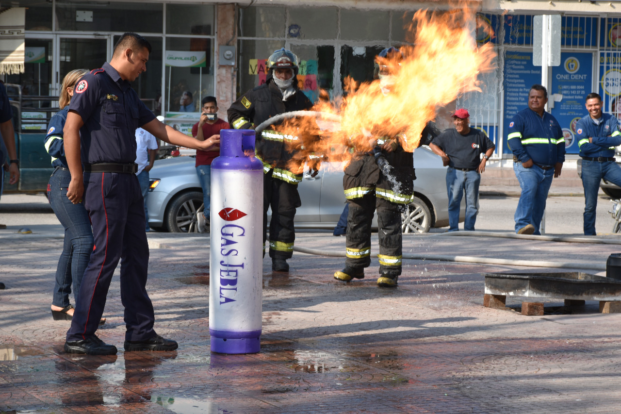 Enseguida, elementos del cuerpo de Bomberos, realizaron un simulacro con tanque de gas y con fuga prendida. Los bomberos mostraron la manera en la que debe manejarse una situación similar, en casas o negocios.