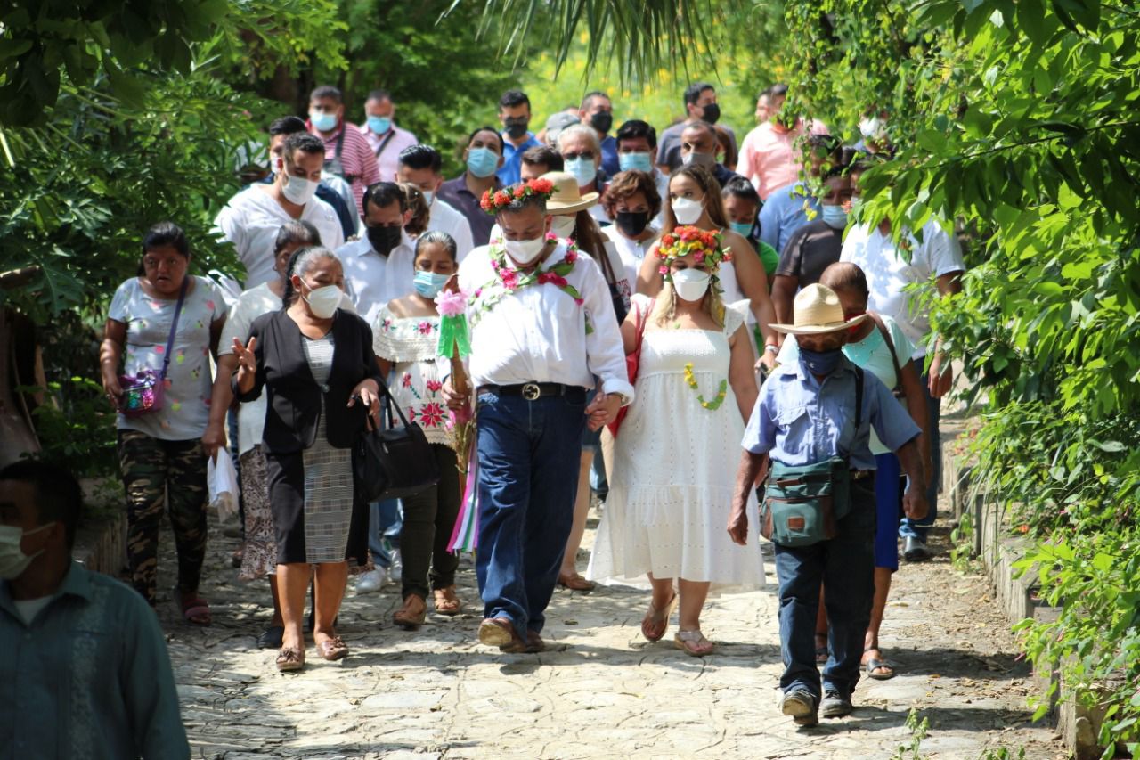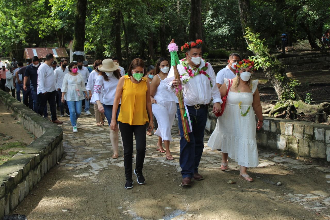 Empezó el ritual con una caminata desde el bohío del ejido La Lima hasta la plaza donde está ubicado el pozo de la comunidad, en la capilla. Ahí fueron recibidos por el consejo indígena.
