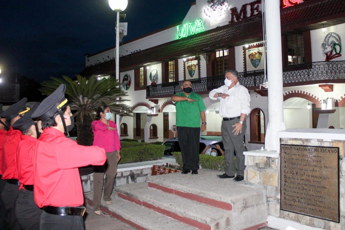 Ciudad Valles, SLP.- Después de tres años sin realizarse homenajes en la plaza principal de Ciudad Valles, el alcalde David Armando Medina Salazar dirigió los honores a la bandera, acompañado de los regidores, de su esposa la señora Enna Avendaño del diputado federal Antoline Guerrero Marquez, síndicos, funcionarios municipales, de José Luis Purata Niño de Rivera presidente de la cámara nacional de comercio (CANACO), representantes del sector educativo, y de ciudadanos que asistieron al primer homenaje.