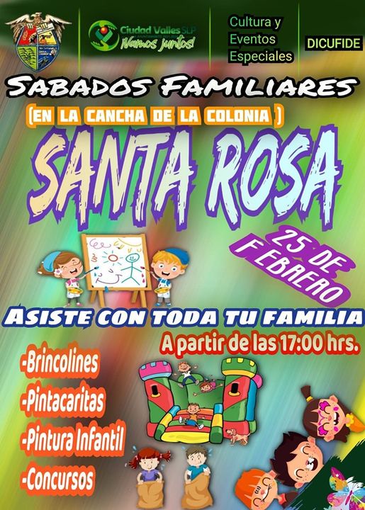 El Programa de Sábados Familiares, promovido por el Ayuntamiento de Ciudad Valles, a través de la Dirección de Cultura y Eventos Especiales, visitará esta semana la colonia Santa Rosa, para llevar a los habitantes de dicho sector actividades de sana convivencia.