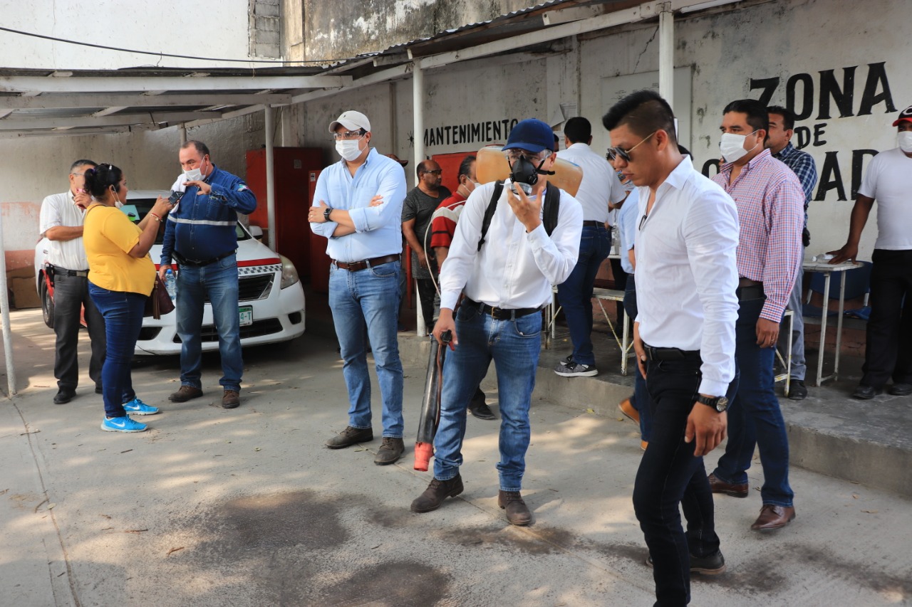 en conjunto con el personal de Comunicaciones y Transportes, coordinan las acciones de sanitización en el interior de las unidades de los taxis para evitar contagios de Covid-19, a los usuarios de este servicio de transporte.