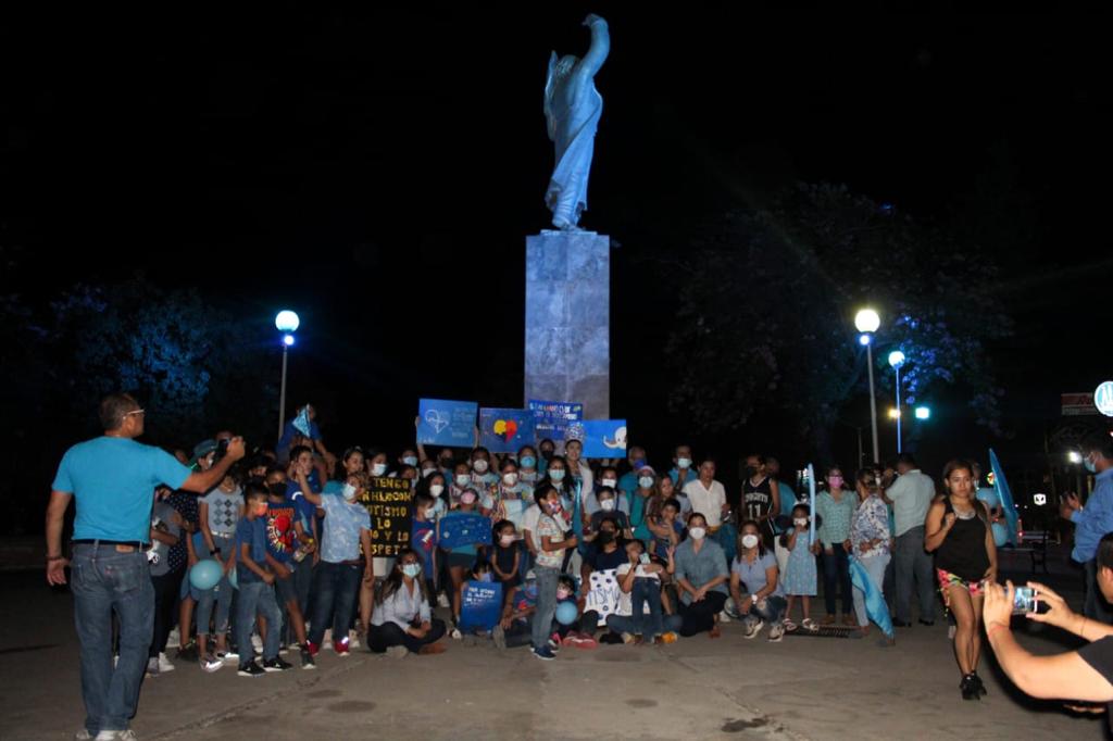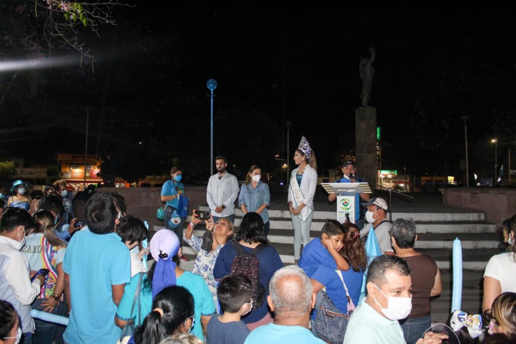 Durante el encendido de las luces azules que iluminan la glorieta a Hidalgo estuvo en representación del alcalde el regidor Santiago Nales Orta y en representación de la presidenta del SMDIF asistió la directora Graciela García Rodríguez, así como la Reina Gay 2022 Karla Victoria y familias con pacientes autistas.