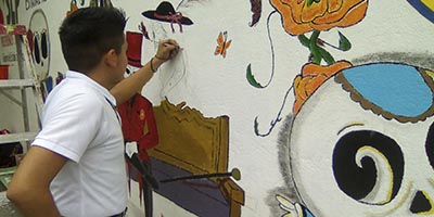 Cd. Valles, S.L.P.-Alumnos de la escuela preparatoria del sistema Educativo Estatal Regular J. José Ortiz Mazo trabajaron en la elaboración de un Mural alusivo al  día de Muertos en donde la imaginación de dos jóvenes lograron plasmar una pintura llena de tradición y fantasía  el cual estarán presentando dentro de los festejo de Xantolo organizado en la institución.